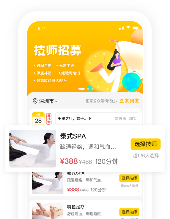 匯集了古法推拿、養(yǎng)生SPA、中醫(yī)推拿、經(jīng)絡(luò)調(diào)理等健康服務(wù)品類(lèi),為用戶(hù)提供高價(jià)值、高標(biāo)準(zhǔn)的健康到家服務(wù)